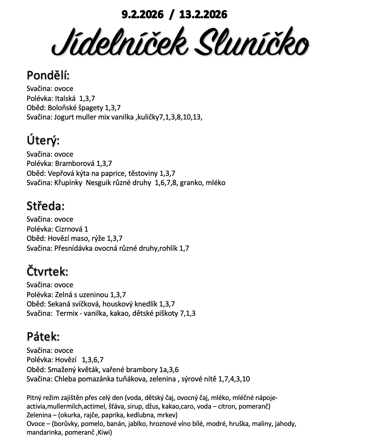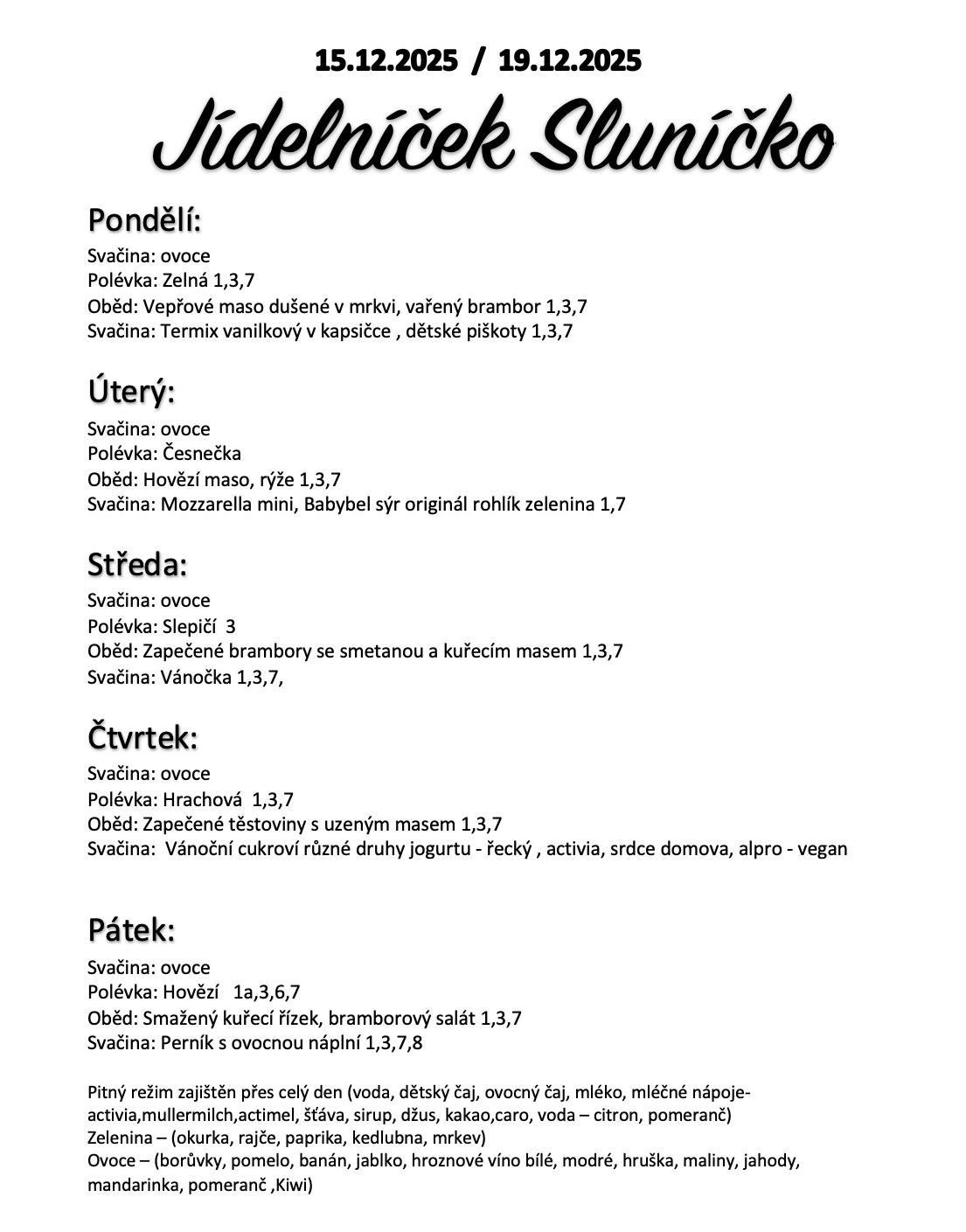 Vyúčtování stravného za konkrétní měsíc bude vždy k poslednímu dni daného měsíce na listině na nástěnce DS.Rodiče jsou povinni hradit uvedenou cenu vždy k 10. dni následujícího měsíce.Platba na účet č.2502254456/2010.